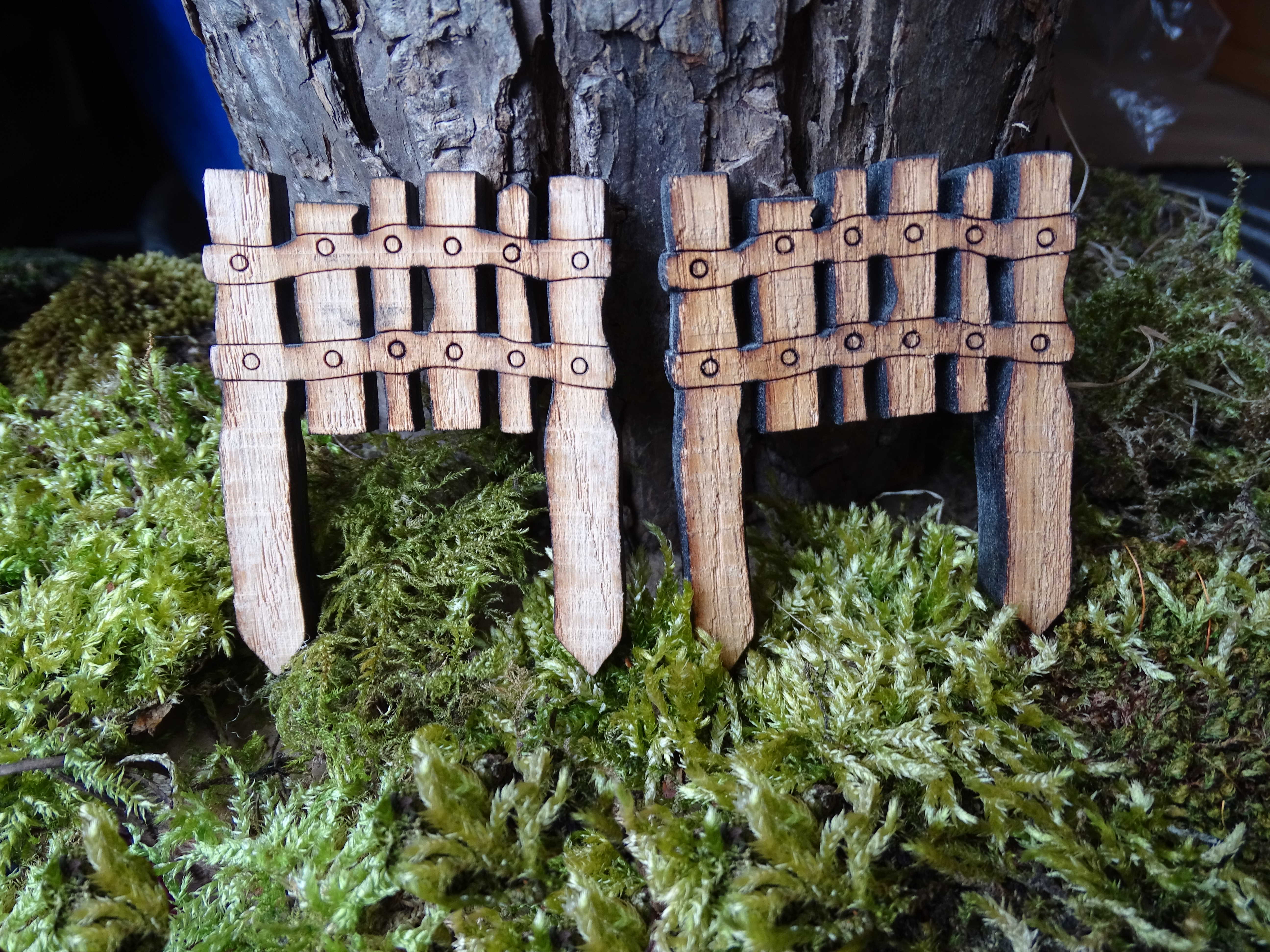 This item contains 2 solid oak fence pieces measuring 6.5cm H 5.5cm W supplied unpainted. Images of the items in finished fairy gardens are for example only.